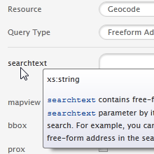 Most search fields reflect parameters of the Geocoder API. Tooltips with additional information will appear when you hover over the field name.