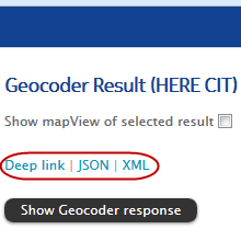 Use the first link to point someone to your Geocoder result in Testsuite. The other links include the API calls for a JSON resp. XML response.