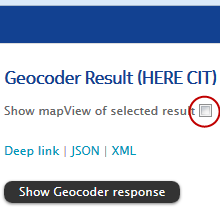 In the Advanced View you can check out the Geocoder response in JSON format. Click one of the black buttons.